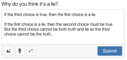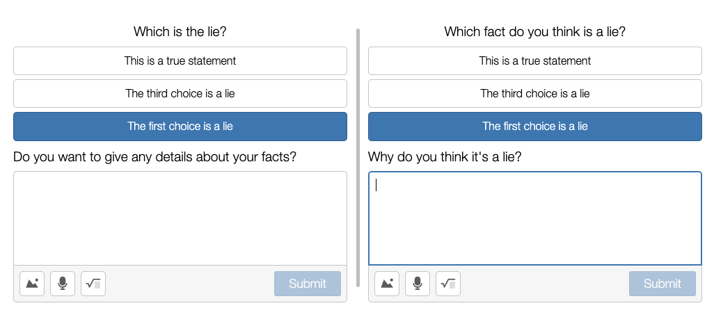 In most Challenge Creators, the student creating the challenge usually ends by completing their own challenge (often to prove that it's solvable). This prompt, however, makes less sense for the person telling the truths and lie than the people guessing them, so you may have noticed a subtle difference in the last creation screen and the response screen: