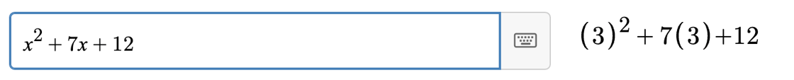 where the string we’re working with is `3x^{2}+5x-2`, the variable we’re looking for is `x`, and the numeric value we’re replacing it with is `(3)`.